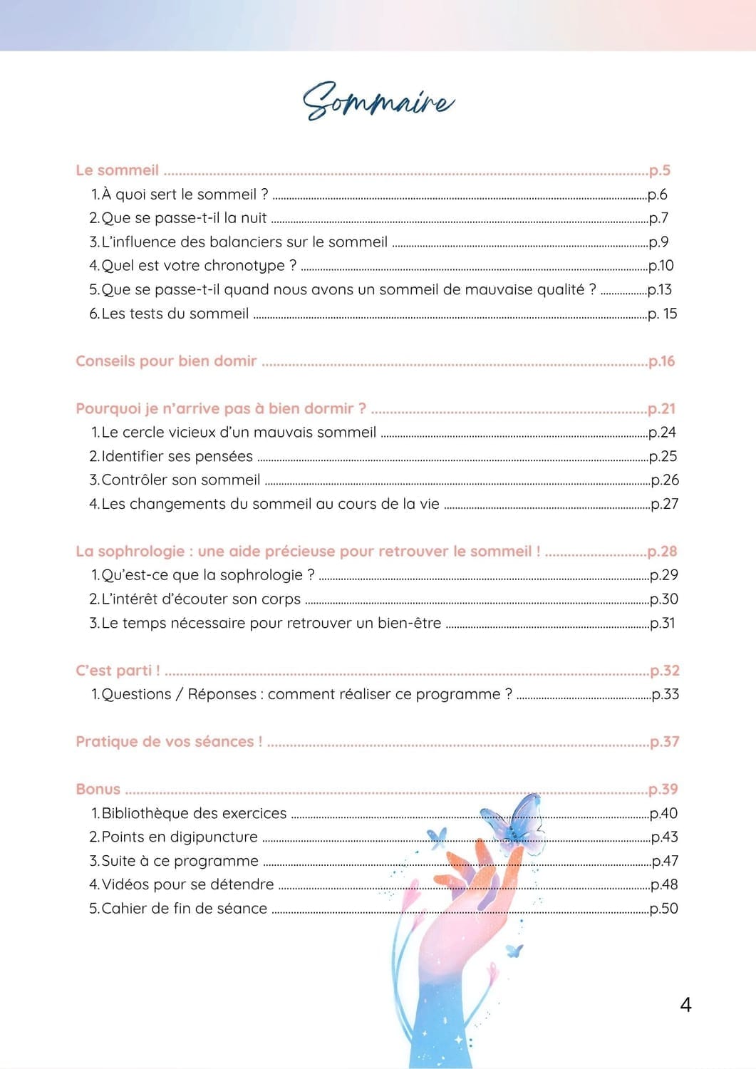 Ce programme contient un e-book PDF + 4 vidéos de séances complètes de sophrologie MP4 + 4 audios des visualisation MP3 + des bonus pour aller plus loin.
