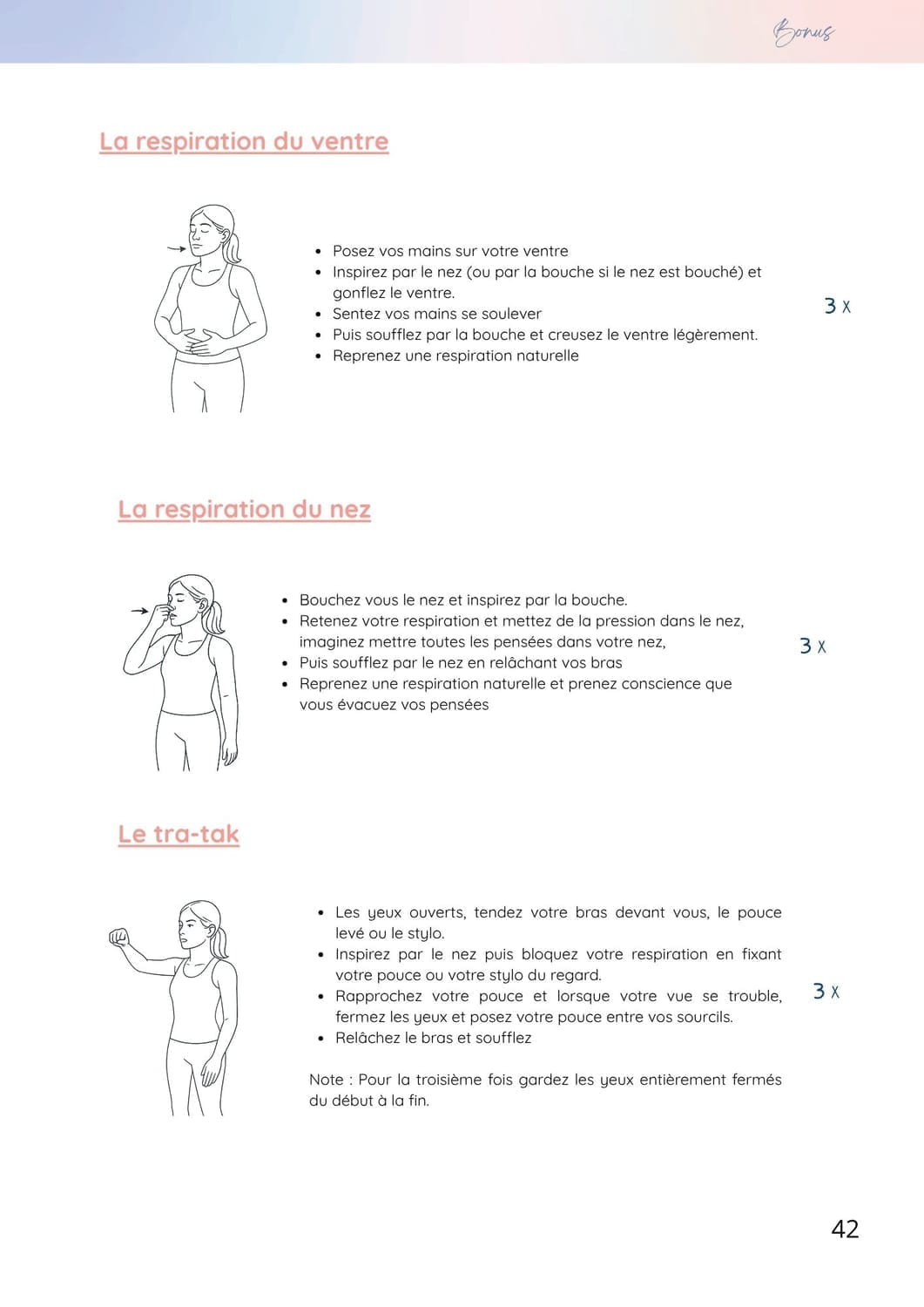 Bibliothèque de 13 exercices pour vous rappeler des consignes et choisir ceux qui vous ont le plus plu pour les refaire dans votre quotidien. Ainsi que l'audio de chacune des visualisations
